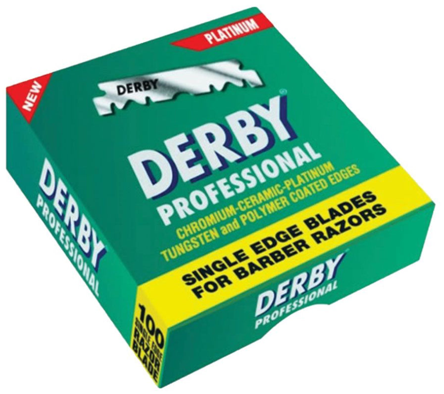 Paquet de 100 lames DERBY unique en acier inoxydable, trempé et affiné trois fois, enveloppées individuellement, l'idéal pour un rasage de qualité à un prix très abordable.