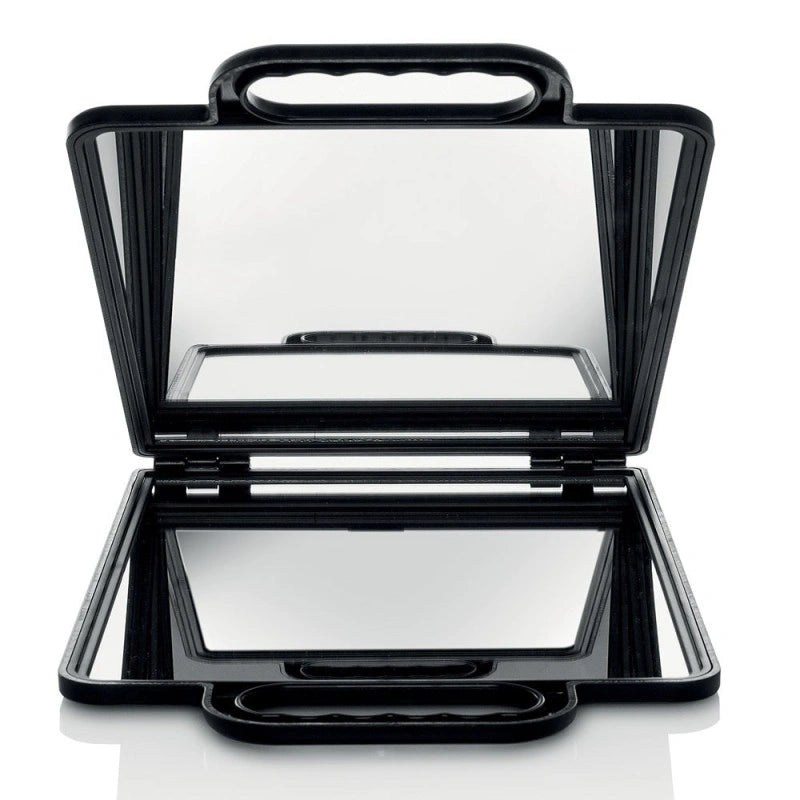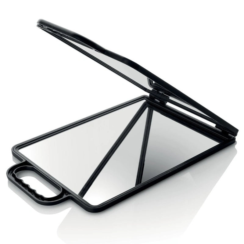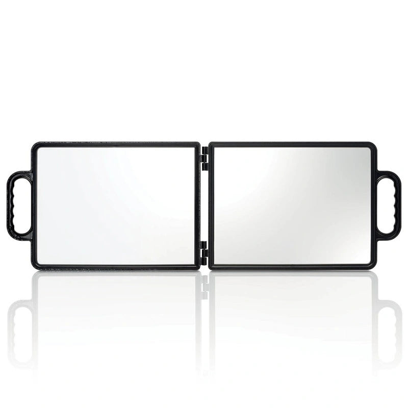 Ce miroir double de coiffure pliable est parfait pour les barbers, coiffeurs et coiffeuses qui souhaitent un miroir de qualité qui durent dans le temps puisque ce dernier permet de se refermer sur lui-même et ainsi se protéger des chocs et faciliter son transport. Avec ses doubles-faces de 28,5 x 21 cm chacune et une longueur totale de 73 cm une fois déployé, il permet de visualiser chaque angle de la coupe de cheveux et/ou barbe. Fabriqué avec des matériaux de haute qualité, ce miroir de coiffure offre une surface réfléchissante claire et sans distorsion.