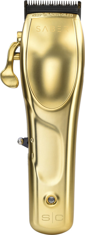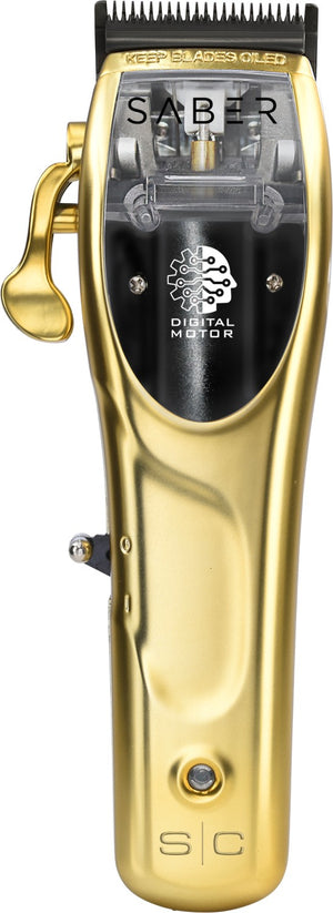 Le clipper SC SABER est une tondeuse de coupe avec un moteur digital brushless de 7500 tr/min très durable et qui en fait une tondeuse costaud et fiable. Le corps de la tondeuse corps métallique en finition doré mat avec en option le couvercle transparent. Le levier de marche est sur le côté du clipper et dans un design old school. Cette tondeuse est équipée d'une lame de 45 mm FADE Black Diamond Carbon DLC qui permettent de travailler de près et avec un couple puissant qui taillera très fort dans la masse. Le support de lame est personnalisable soit en regular ou en stretch pour personnaliser la course courte ou longue (0,3 à 1.5 mm). Le socle de charge inclus est antidérapant et rechargera le clipper STYLE CRAFT INSTINCT en 120 min pour 195 min d'autonomie. 8 sabots magnétiques de 1,5 à 19 mm. Poids : 400 g